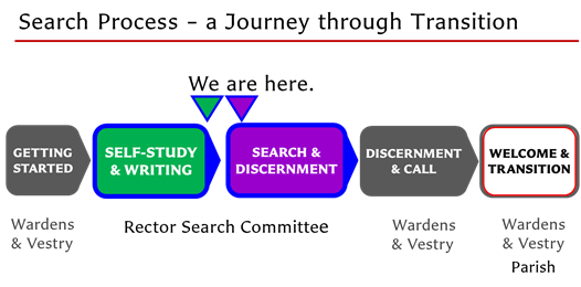 The Self-Study & Writing stage is essentially complete. The Parish Profile and OTM (Office of Transition Ministry) Community Portfolio documents are ready for Vestry review. We will let you know when the Profile is available on our website. We have done preparatory work for the Search & Discernment stage, such as developing criteria and key questions, and identifying people to invite to apply when the search goes live. We will report more about the process when there is something to report.